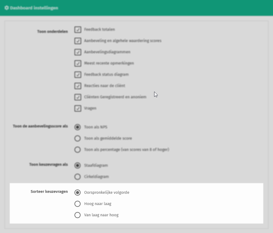 Hier kun je bepalen hoe je de resultaten van de aanbevelingsvraag wil weergeven. Die kan uitgedrukt worden als Net Promotor Score, gemiddelde score of percentage waar een 8 of hoger gescoord is. Hierbij is vooral op te merken dat voor de NPS een score van 9 of 10 bepalend is voor het aantal promoters, waarbij bij het percentage van 8 of hoger ook de 8 wordt meegenomen. Deze laatste kan zeker voor Nederlandse begrippen gunstiger uitpakken.